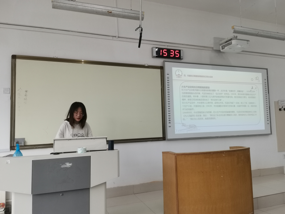 李飞燕、毕钰钒同志以《全民族抗日战争的中流砥柱》为题,向同学们讲解了——党的全面抗战路线和方针的制定、中国共产党开展敌后抗日游击战争和坚持统一战线中的独立自主以及坚持抗战、团结、进步的方针。