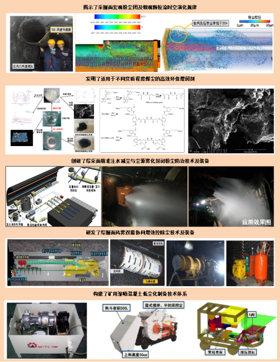 点击:职业安全健康防护方向现有专职教师15人,其中教授5人、副教授4人,其中国家级人才3人。该研究方向主要围绕我国工矿生产性粉尘污染与职业危害防控问题,历经近二十年持续攻关,取得了系列创新性成果:基于颗粒离散元技术提出了宏细观粉尘预测分析法,揭示了采掘面宏观粉尘团及细观颗粒群扩散污染机制;首次提出了14类煤种煤尘微观理化结构与其润湿性关联作用机制,创建了煤尘微观润湿理论并研发了多元水基介质抑尘技术;突破了综掘面全断面风幕控尘关键技术,研创了小型化风雾双幕协同增效控除尘成套装备;发明了矿用混凝土喷射机(我国首台煤安认证)及强制搅拌机、喷射辅助机械臂等设备;提出了交变-脉冲注水及局部雾化封闭技术,形成了综采面时空一体化减除尘关键技术及装备。