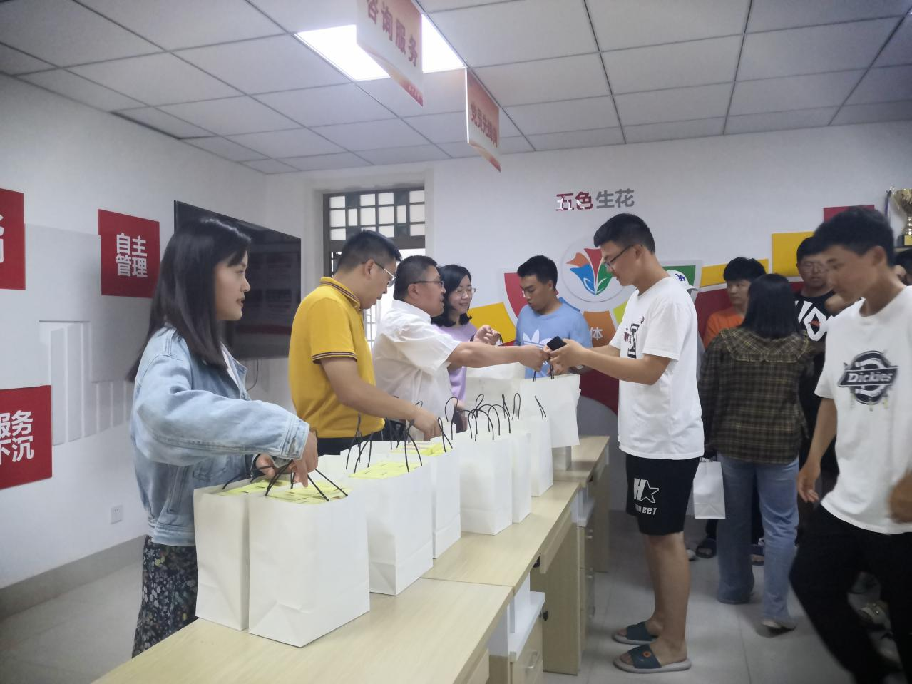王建友与新生同学们亲切交流,代表学院领导和老师向新生同学送上节日的祝福,提醒同学们要给远在故乡的父母打电话、发视频、报平安、送祝福;叮嘱同学们要过好在校生活,认真学习,不断锻练提升自己;鼓励同学之间加强了解,互相帮助,建立融洽的学习生活氛围。他说,同学们要尽快适应大学生活,明确奋斗目标,让大学时光成为人生中最美好的一段旅程。随后,老师向同学们发放中秋月饼。