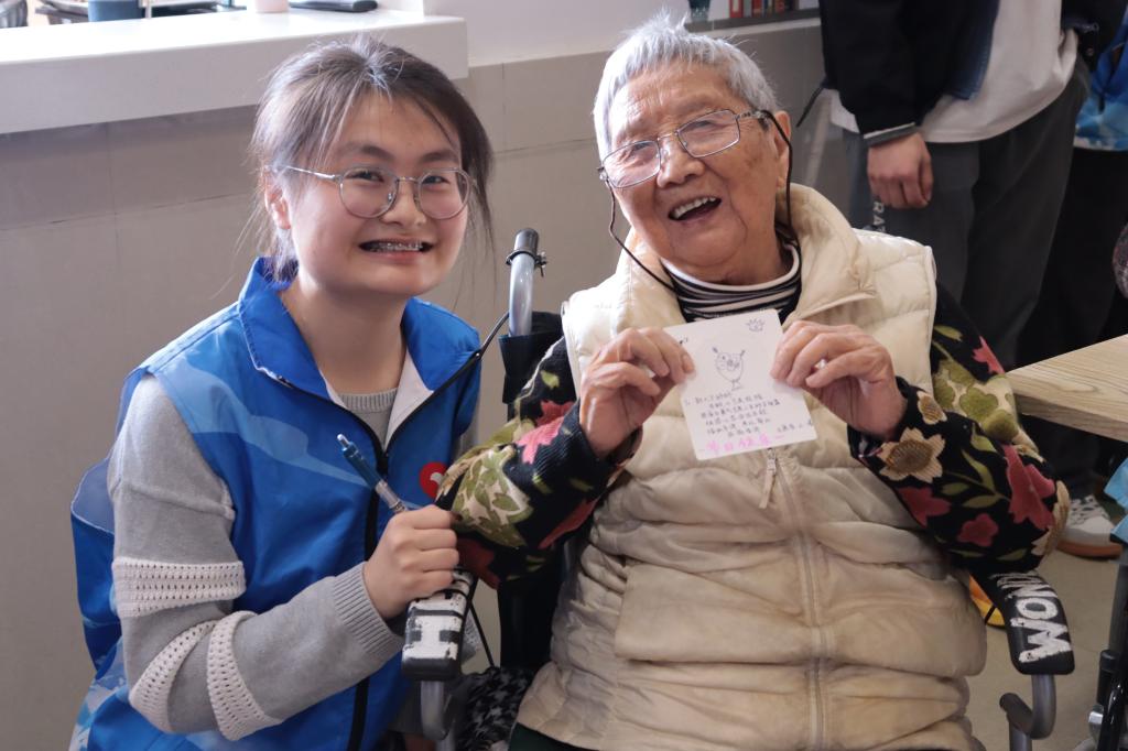 文艺表演结束后,志愿者们分组陪伴爷爷奶奶开展手绘贺卡、象棋对弈活动。志愿者们耐心陪伴老人们用彩笔描绘节日祝福,用棋子博弈青春激昂。手工、下棋之余,志愿者们围坐在爷爷奶奶身旁,聊天叙事,分享生活趣事,聆听人生故事。护养院张奶奶感动地说:“孩子们能来陪我们过节,心里特别暖!”