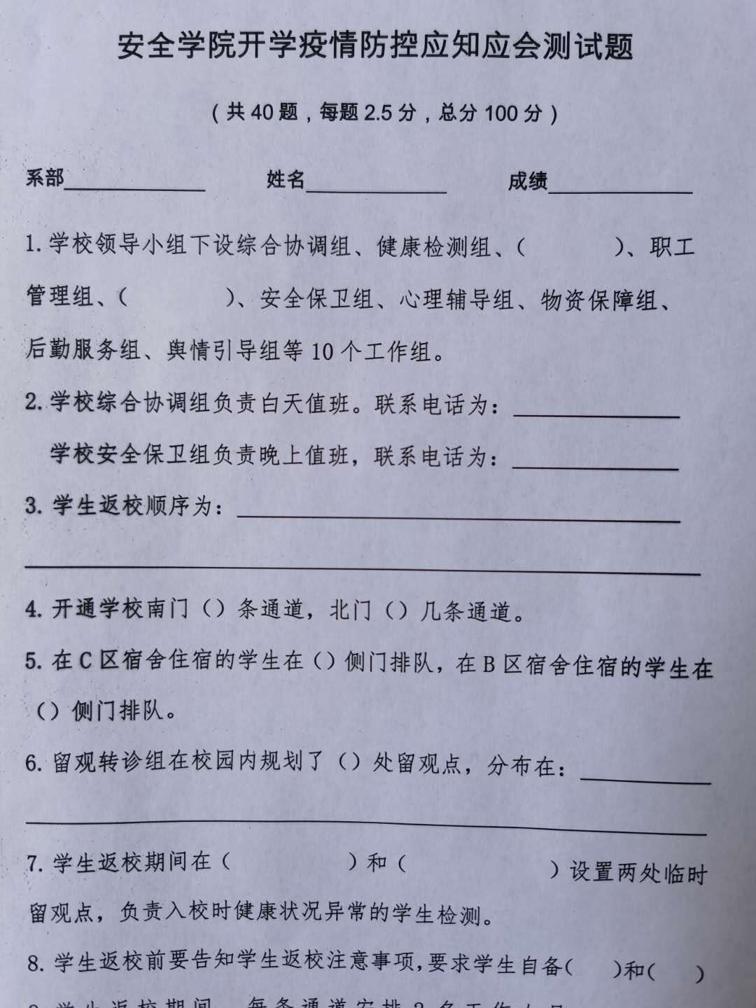 本次测试采取电子答题的方式,共有40道题目,题型包括填空题、简答题,满分100分,测试内容涵盖防控知识、学校防控工作流程、应急处理流程及复课准备相关工作等方面。全院教职工将此次测试作为巩固强化疫情防控知识和能力的有利契机,高度重视,积极参与,进一步了解、掌握了疫情防控知识、教育要点和应急处置方法,熟悉学校复课及防控工作流程,明确在校的疫情防控职责,做到疫情防控和开学准备工作相关知识入心入脑。