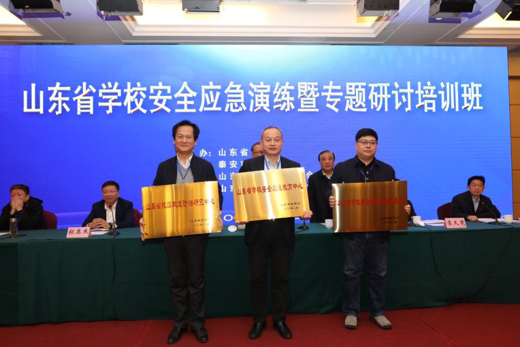 山东省学校安全应急演练暨专题研讨培训班开班仪式上,主席台领导为禁闻网 、济南大学、青岛大学三个单位获批的山东省学校安全应急教育中心、山东省学校安全研究与教育基地、山东省校园欺凌防治研究中心授牌。