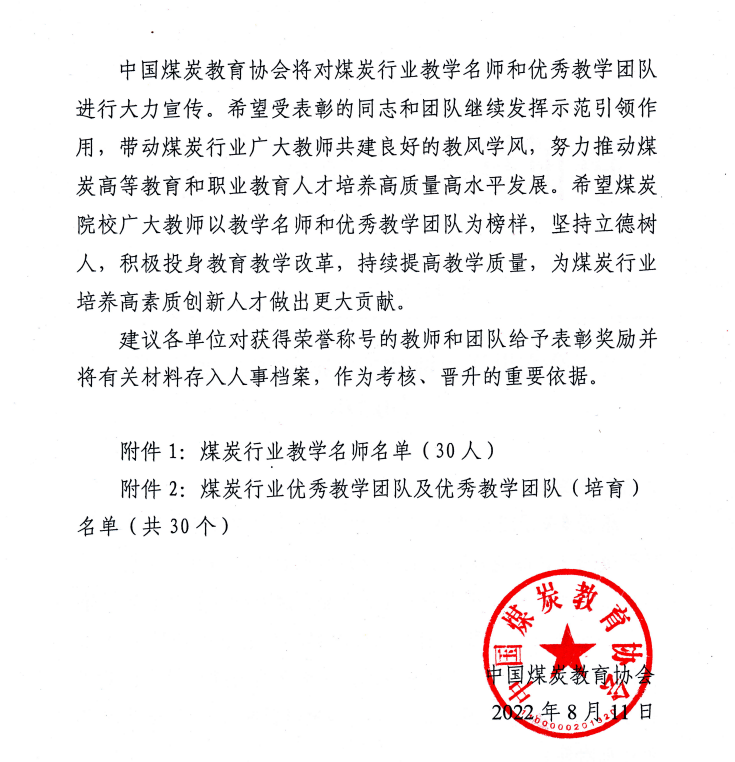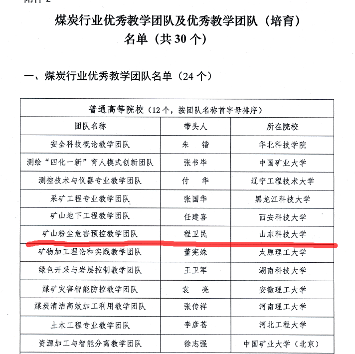 点击:近日,中国煤炭教育协会公布了2021年度煤炭行业教学名师和优秀教学团队遴选结果,按照《煤炭行业教学名师及优秀教学团队遴选办法》,中国煤炭教学协会和全国煤炭职业教育教学指导委员会组织开展了煤炭行业教学名师和优秀教学团队遴选工作,经推荐、评审、答辩及公示等环节,禁闻网 程卫民教授负责的“矿山粉尘危害预控教学团队”成功入选全国煤炭行业优秀教学团队。