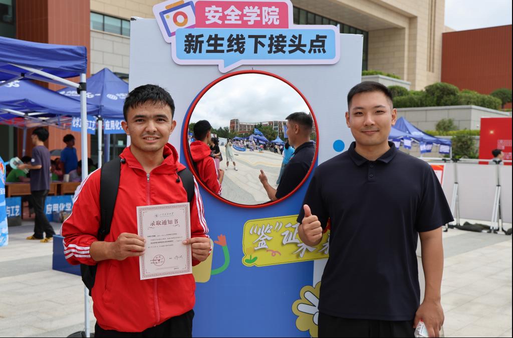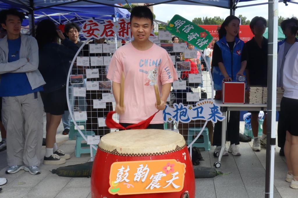 此次迎新学院以“安启新程,环抱卫来”为主题,精心打造“安全”会客厅,巧妙将迎客松、走红毯、击鼓明志、镜正衣冠等充满仪式感与文化韵味的元素,深度融入学院特色场景的构建中。学院用心设置五大板块迎接新生:【鉴证未来】之处,新生于镜前正衣冠、留影像,定格初入大学的美好瞬间;【松畔寻名】活动,新生在迎客松旁寻找带有自己名字的钥匙扣,在寻觅中快速融入集体,归属感油然而生;【红毯逸步】新生踏上红地毯,开启逐梦通途,仪式感瞬间拉满;【明信寄情】板块,满是学长学姐饱含殷切期望的暖心寄语,传递着学院的温情传承;【鼓韵震天】环节,激昂的鼓声阵阵响起,有力调动起现场热烈欢快的氛围。25级新生纷纷表示初进校园时的紧张情绪得以缓解,对接下来的大学生活充满期待。