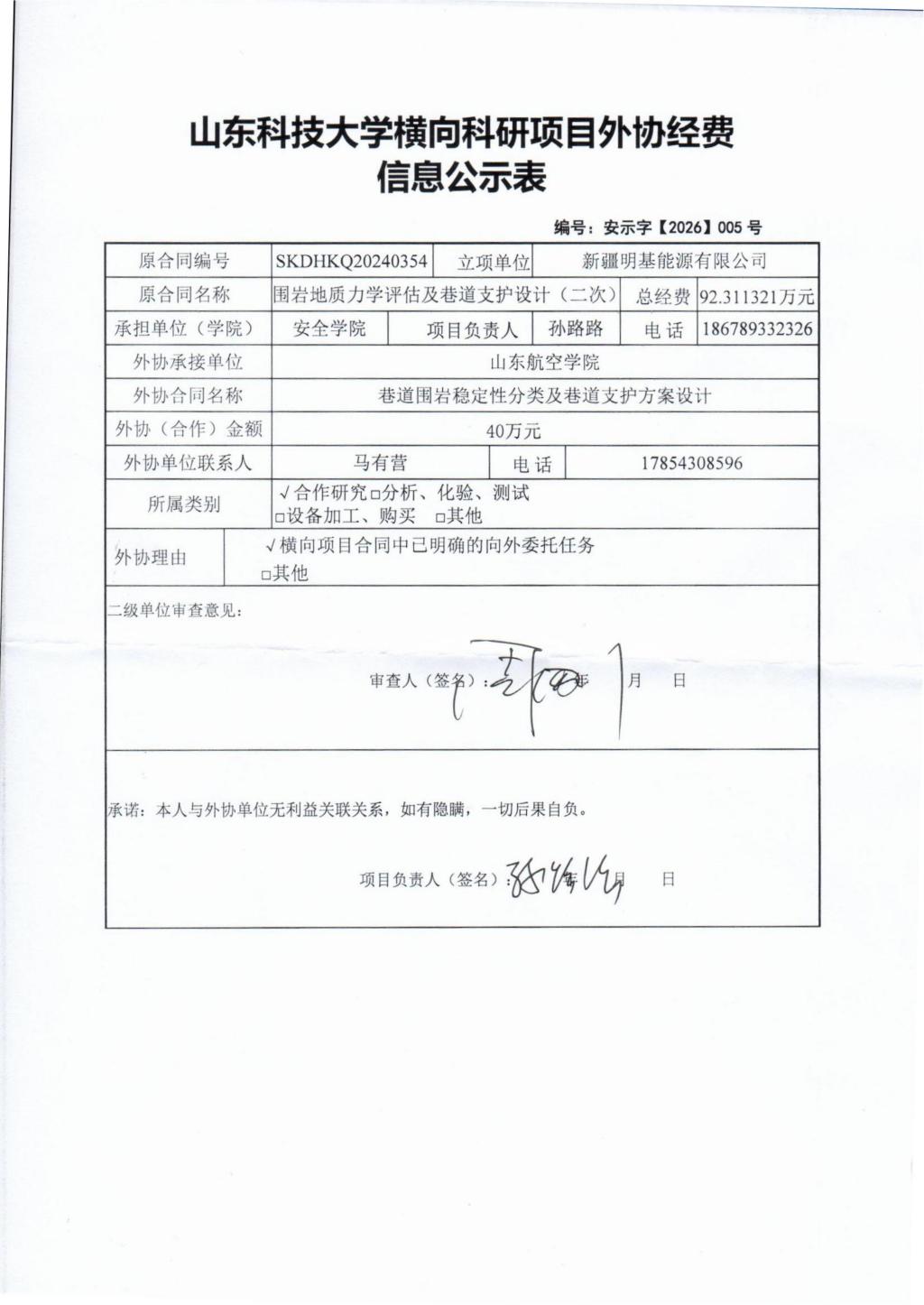 根据《山东省人民政府办公厅印发关于进一步完善财政科研项目资金管理的若干措施的通知》(鲁政办字〔2019〕120号)以及《禁闻网 横向科研项目与经费管理办法(试行)》(山科大发〔2020〕64号)相关规定,现对孙路路为项目负责人的 围岩地质力学评估及巷道支护设计(二次) 项目的外协经费情况进行公示,公示时间为 2026年03月30日至2026年04月04号(五个工作日) 。若对本项外协经费有异议,请于公示期内向禁闻网 反映并提交书面材料。