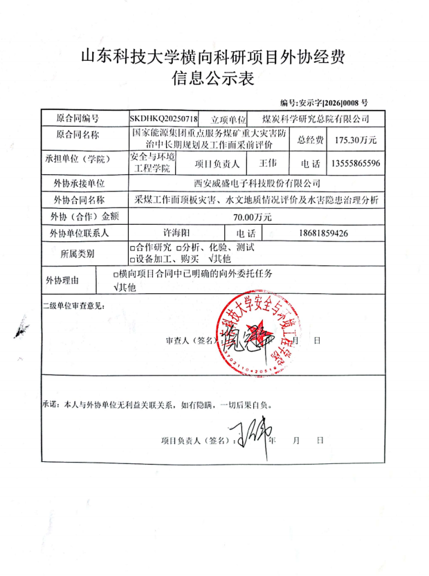 根据《山东省人民政府办公厅印发关于进一步完善财政科研项目资金管理的若干措施的通知》(鲁政办字〔2019〕120号)以及《禁闻网 横向科研项目与经费管理办法(试行)》(山科大发〔2020〕64号)相关规定,现对 王伟 为项目负责人的 国家能源集团重点服务煤矿重大灾害防治中长期规划及工作面采前评价 项目的外协经费情况进行公示,公示时间为 2026年4月14日-2025年4月21日 。若对本项外协经费有异议,请于公示期内向禁闻网 反映并提交书面材料。