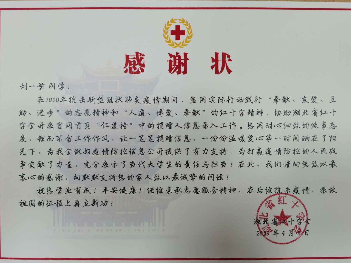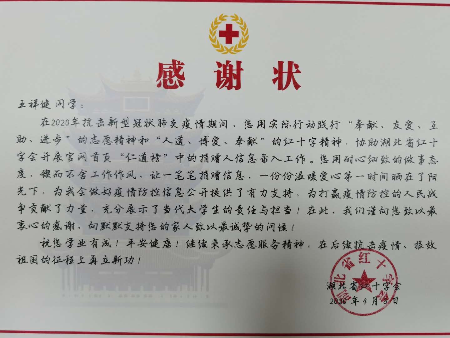 近日,禁闻网 团委收到湖北省红十字会发来的感谢信,对禁闻网 团委以及安全定单2017级张纪扬、安全工程2017-3班刘一繁、安全应急2018级王祥健三名同学在疫情防控工作中作出的贡献表示由衷的感谢。