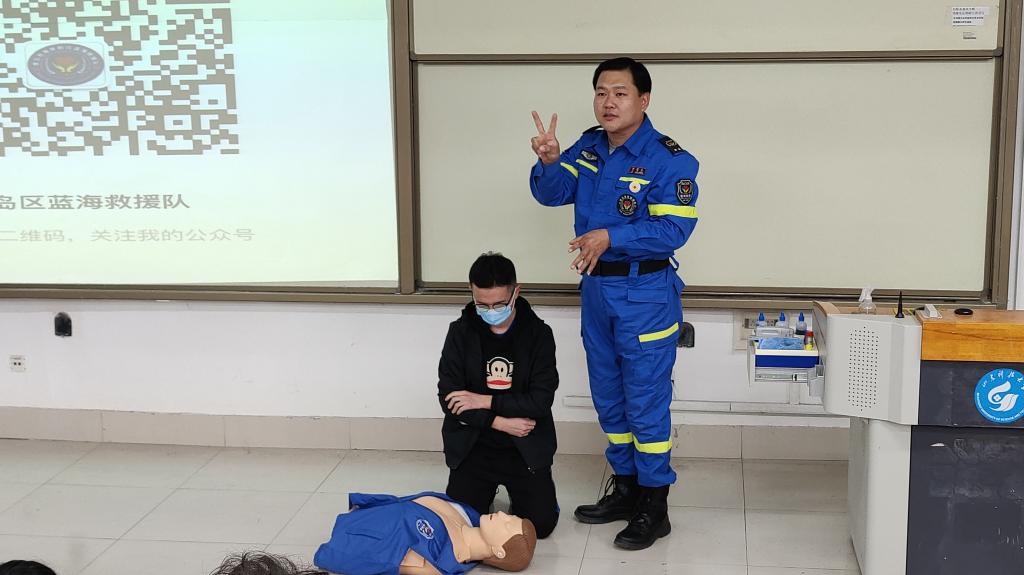 此次培训活动分为理论和实操两部分。会上,蓝海救援队培训老师以生动的语言、真实的案例,围绕突发事件,结合大学生日常学习和生活,分别就溺水、车祸、自然灾害等偶遇突发事件和心肺复苏、创伤急救包扎的科学抢救办法等进行了详尽的讲解。在随后的实际操作中,培训老师通过示范操作,手把手、一对一指导,让参训的学生熟悉并掌握心肺复苏、创伤急救包扎的科学要领和注意事项,并且耐心解答同学们提出的问题,指出同学们在实际操作中的不足。在场同学们认真聆听、仔细记录并踊跃参与模拟操作,力争使每一个实操动作标准、到位。
