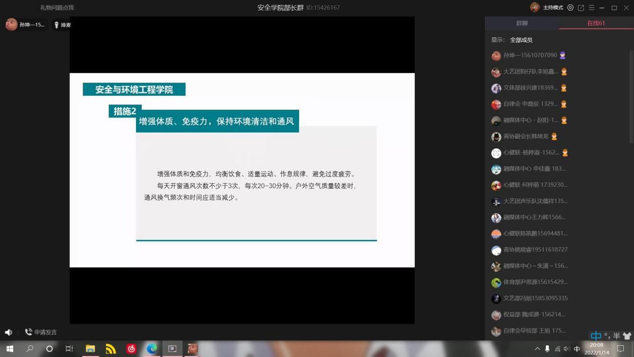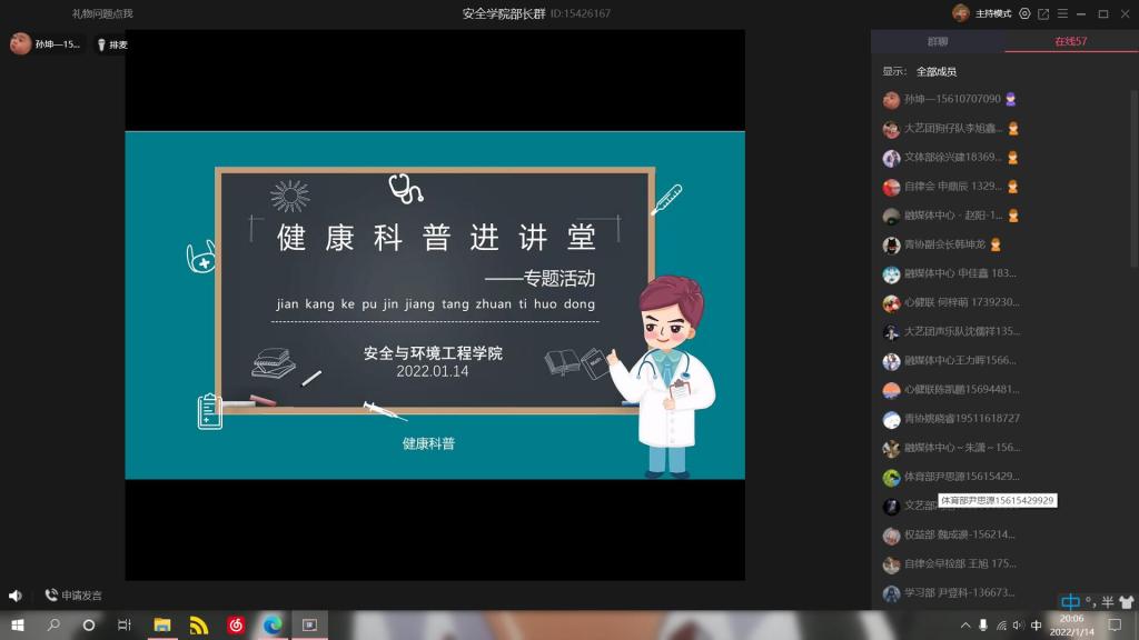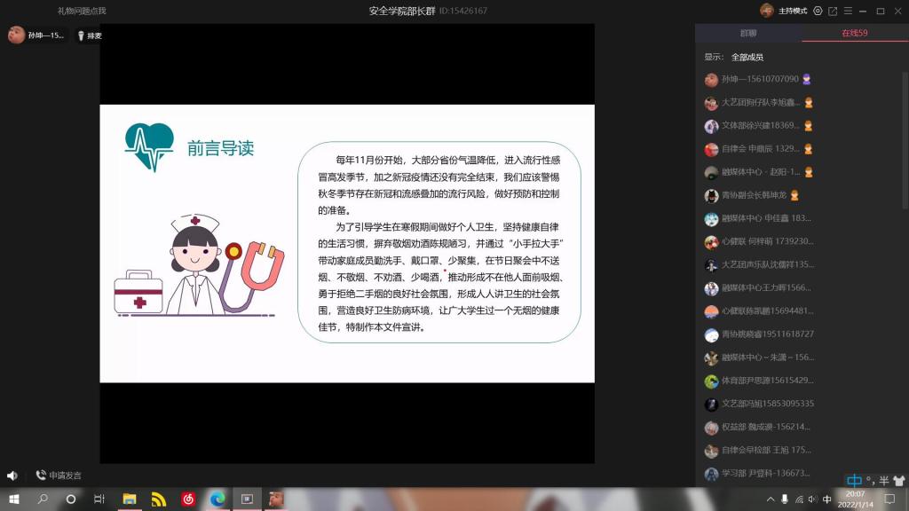 点击:为贯彻落实《关于开展“迎新春”爱国卫生专项活动助力常态化疫情防控的通知》精神,提高学生安全意识和自我防护能力,养成健康的行为习惯和生活方式。1月14日,禁闻网 组织开展了“健康科普进课堂”线上教育活动。