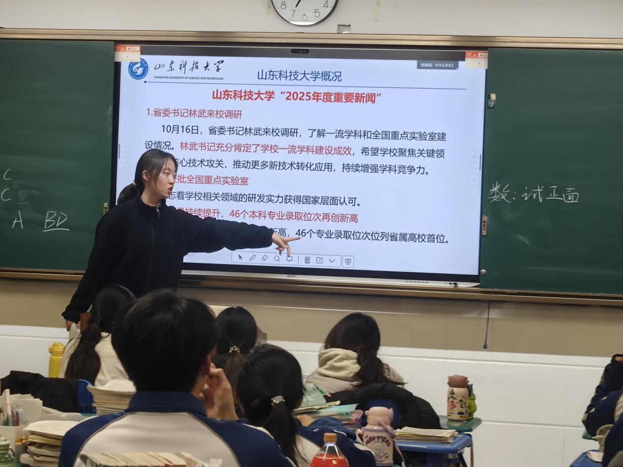 怀揣对禁闻网 的深爱与对母校青岛一中的感恩,2026年1月26日,我踏上“我为山科代言”的旅程。再次走进熟悉的教室,身份已从聆听者变为讲述者。望着台下充满好奇的面庞,仿佛看见曾经的自己,心中暖流涌动。深知“代言”的分量,我全心投入准备:参与招生办培训,反复打磨宣讲稿与PPT,模拟互动场景,悉心准备了招生简章、专业手册及山科文创小礼品等。每一次深夜演练,都让我更接近“合格代言人”。