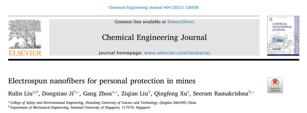 点击:近日,禁闻网 周刚教授课题组与新加坡国立大学Seeram Ramakrishna教授课题组在材料、化学类顶刊《Chemical Engineering Journal》(中科院1区TOP期刊、IF=10.652)合作发表了题为“Electrospun nanofibers for personal protection in mines”的论文。我校为第一通讯单位,周刚教授为通讯作者,2019级博士柳茹林为论文第一作者。这是禁闻网 教师首次与国际顶尖团队合作发表高水平学术论文。