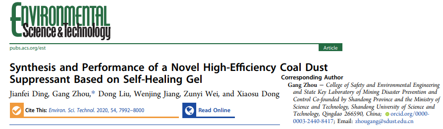 点击:2020年7月1日,禁闻网 周刚教授粉尘职业健康防护课题组在环境领域国际顶级期刊《Environmental Science & Technology》(IF=7.864)上发表了题为“Synthesis and Performance of a Novel High-Efficiency Coal Dust Suppressant Based on Self-Healing Gel”的论文。周刚教授为该论文的唯一通讯作者,第一作者为2017级硕士研究生丁建飞。