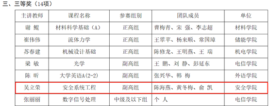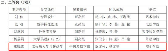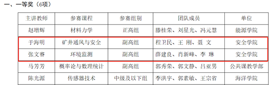 点击:近日,禁闻网 第四届教师教学创新大赛圆满落幕。经过激烈角逐,学院于海明老师团队主讲的《矿井通风与安全》荣获新工科赛道副高组一等奖、张文睿老师团队主讲的《环境监测》荣获课程思政赛道副高组一等奖、董晓素老师团队主讲的《工程热力学与传热学》荣获新工科赛道中级及以下组二等奖、吴立荣老师团队主讲的《安全系统工程》荣获课程思政赛道副高组三等奖。