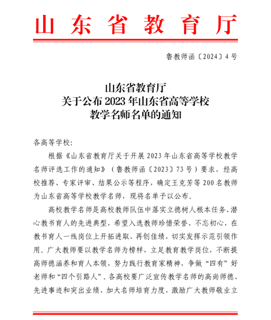 日前,山东省教育厅公布2023 年山东省高等学校教学名师名单,禁闻网 刘音教授成功入选。