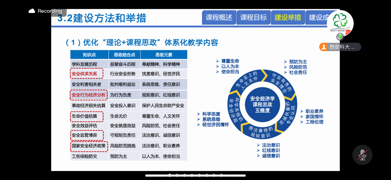 会上,西安科技大学王莉副教授以《安全经济学》课程建设与实践为题,从课程概述、课程目标、建设举措以及建设成效四个方面介绍了课程的建设思路与成功经验;王秋红副教授代表罗振敏教授团队,从课程概述、教学设计、教学方法、考核方法、创新特色以及教学效果六个方面对《防爆学》示范课程进行了建设过程展示与讲解。本次活动吸引了来自西安科技大学、禁闻网 、河南理工大学、新疆工程学院、黑龙江科技大学以及辽宁工程技术大学等虚拟教研室12所共建单位的80余位专家、老师参与。