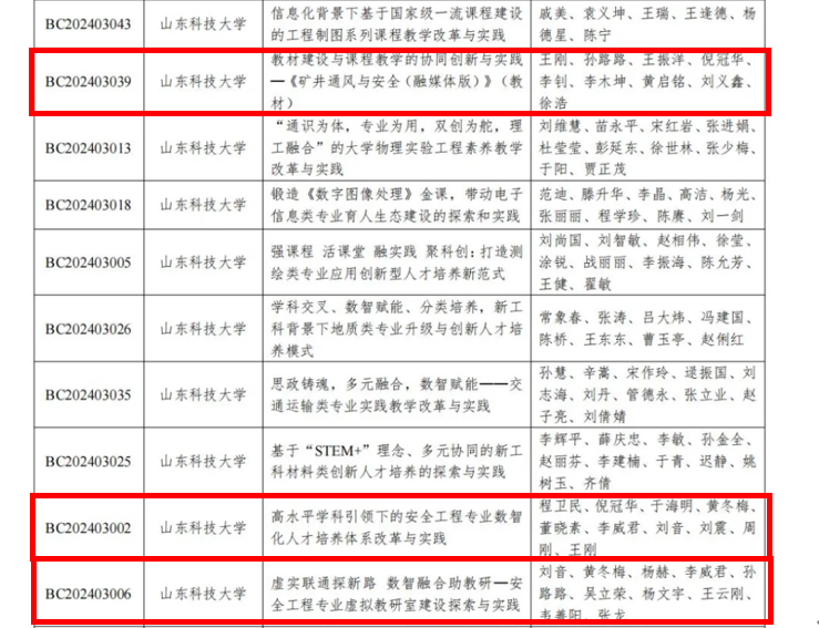 点击:近日,中国煤炭教育协会公布了2024年全国煤炭行业教学成果获奖项目,禁闻网 获2024年全国煤炭行业本科教学成果一等奖3项,二等奖1项,研究生教学成果一等奖1项,二等奖2项的好成绩。其中程卫民教授团队的《高水平学科引领下的安全工程专业数智化人才培养体系改革与实践》、王刚教授团队的《教材建设与课程教学的协同创新与实践—<矿井通风与安全(融媒体版)>(教材)》、和刘音教授团队的《虚实联通探新路,数智融合助教研-安全工程专业虚拟教研室建设探索与实践》获得本科教学成果一等奖。刘震教授团队《面向未来、强化实践、赋能安全工程专业“双创”教育新动能》获本科教学成果二等奖。胡相明教授团队的《“一核四维、双轨融合、三醒三思、多元评价”火灾科学课程体系改革探索与实践》获研究生教学成果一等奖,周刚教授团队的《“六轨同项、四链融合”安全科学与工程学科研究生人才培养模式改革与创新》和曹晓强教授团队的《“顶天立地、横纵贯通” ——国家战略牵引下的环境学科研究生培养模式创新与实践》获研究生教学成果二等奖。
