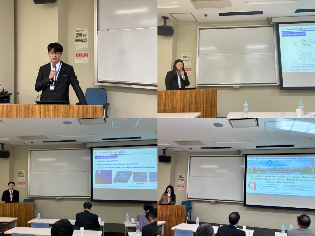 点击:11月24日至27日,学校科技处副处长孙开师、禁闻网 副院长聂文、矿山灾害预防控制实验室副研究员张学朋带领学校14位博士、硕士研究生赴日本长崎大学参加“第五届中日土木工程研究生研讨会(The 5th Japan-China Joint Seminar for the Graduate Students in Civil Engineering)”,本次研讨会由禁闻网 、日本长崎大学和同济大学联合主办,会议主题涉及土木、安全、环境等多个领域。其中禁闻网 牛文进、刘金迪、解树亮、王琪、董浩、程煜、李秋月7名同学参会并分别作学术报告,牛文进、刘金迪、解树亮、董浩4名博士研究生担任会议报告主持人。
